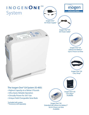 The Inogen One G4 system is more than just a concentrator; it's a comprehensive solution that includes everything you need to live life to the fullest. Here's what you'll find in the Inogen One System: