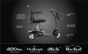 Stay in control with Turtle Mode, limiting your top speed for safer operation in tight or crowded spaces. With a top speed of 4 mph and a drive range of up to 6.9 miles, you can go farther without stopping to recharge. The battery charges on or off the scooter, and Pride’s black, non-scuffing tires offer smooth traction on indoor and outdoor surfaces.