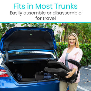 Providing a smooth, comfortable ride, the Vive Mobility Series A Mobility Scooter is perfect for navigating in your home, at the market and on the go. With a ground clearance of 3.5”, the electric scooter easily clears most door jambs and smoothly rolls over flooring changes on four, 8.86” flat-free tires.