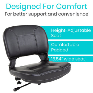 Our Series A power scooter is designed for comfort, safely supporting up to 298 pounds with a large platform and height-adjustable captain's seat.Comfortably padded, the wide, 16.54” seat and backrest provide gentle cushioning and support. Additionally, the scooter seat is surrounded by two padded armrests that adjust and flip upward for greater convenience when exiting or boarding.