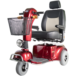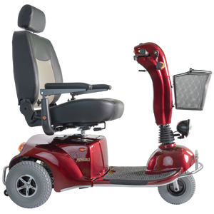 The Pioneer 9 is a 3-wheel heavy-duty scooter. It has a weight capacity of 500 lbs, a reinforced steel front bumper, large 10-in. flat free tires, and a strong suspension. Going 6 mph and lasting as long as 32 miles on a charge, the Pioneer 9 is an excellent choice.