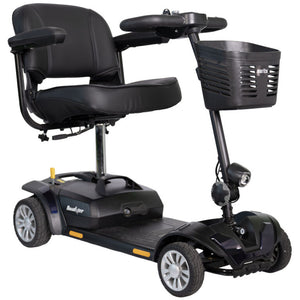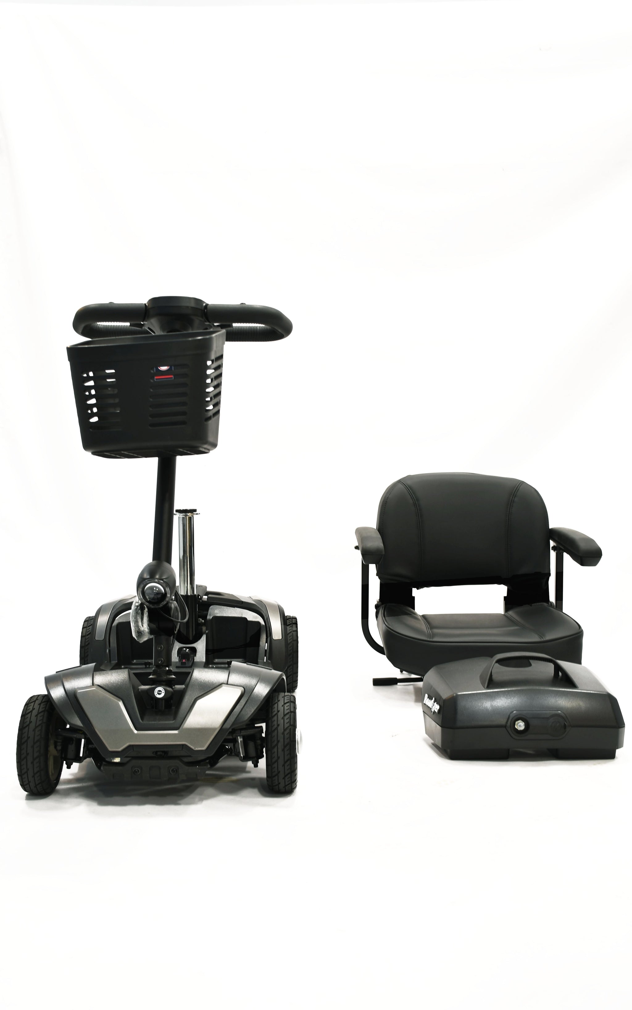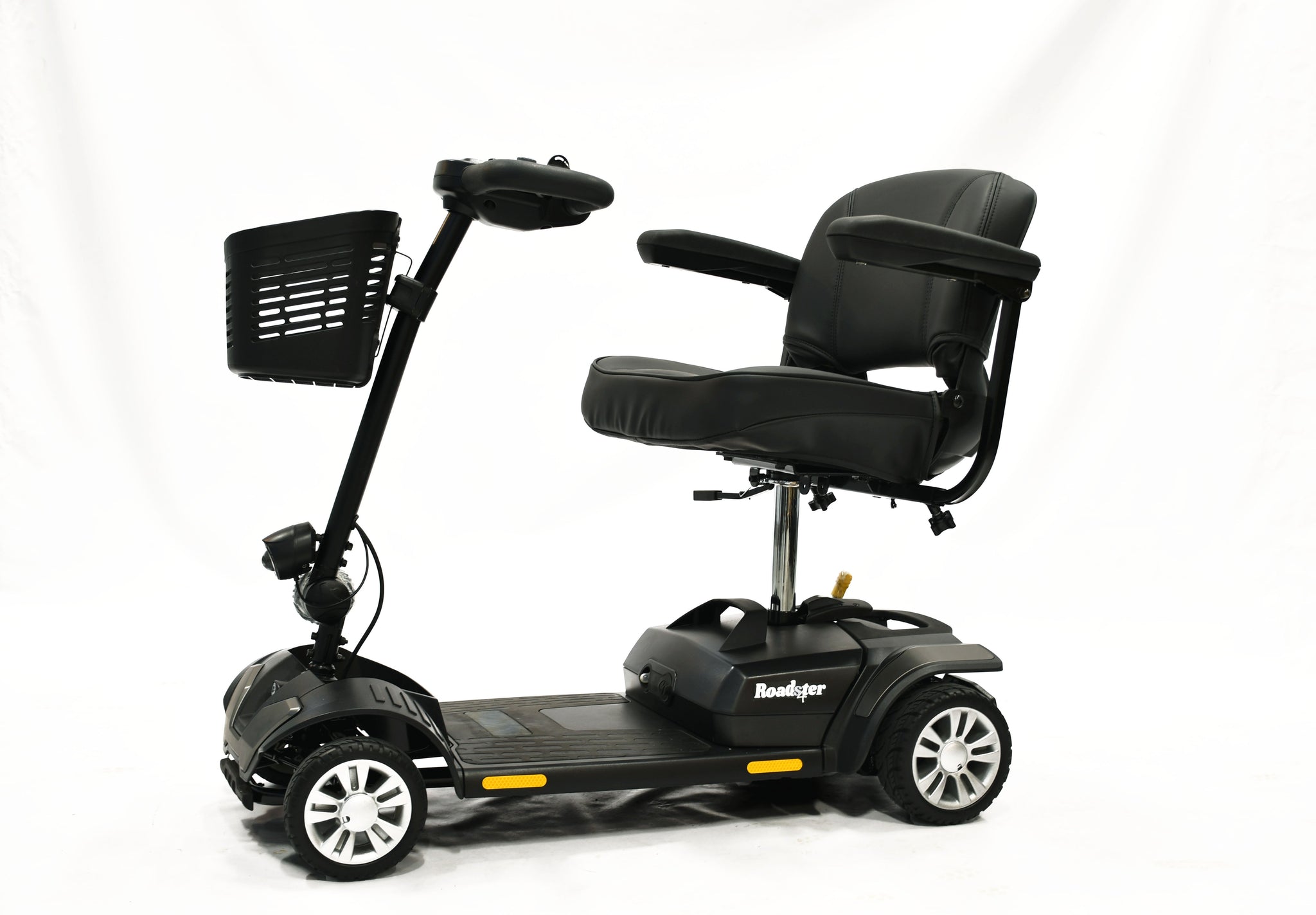 Roadster S4 is the latest travel mobility scooter from Merits Health. This smart-looking travel scooter is affordable and travel-ready. The S4 disassembles into 5 manageable pieces for easy transport with the heaviestportion weighing only 36 pounds. No tools arerequired thanks to its user-friendly design. In just a few simple steps the Roadster S4 can be disassembled and reassembled quickly and painlessly. Thefour-wheel design of the S4 gives it increased stability when compared to3-wheel travel scooters.