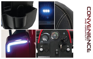 Illuminate your path in style with the Victory 10.2's brilliant LED lighting package. A trio of LED headlights not only enhances visibility but also adds a touch of luxury. The lower adjustable path light focuses directly on the road, while the upper lights cast a glow all around. An onboard puddle light below the tiller further enhances the sense of opulence, making the Victory 10.2 feel more like a luxury car than a mobility scooter.